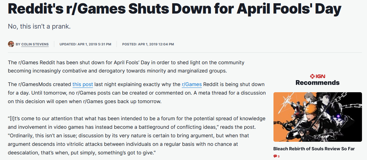 At the same time, we also knew the potential impact we had within our space overall, and as such, we made multiple endeavors to make it welcoming, as well as an opportunity for developers to shed some light on the projects they were working on. To this end, we began organizing Ask Me Anything opportunities in collaboration with interested developers, as well as designating specific times for developers to be able to share their game free of any rules against self-promotion. My most significant involvement was when the subreddit shut down for April Fool’s in 2019, highlighting what was becoming an increasingly caustic atmosphere. This both called attention to the issue and made our stance clear on the subreddit being an inclusive and welcoming space for all enthusiasts.